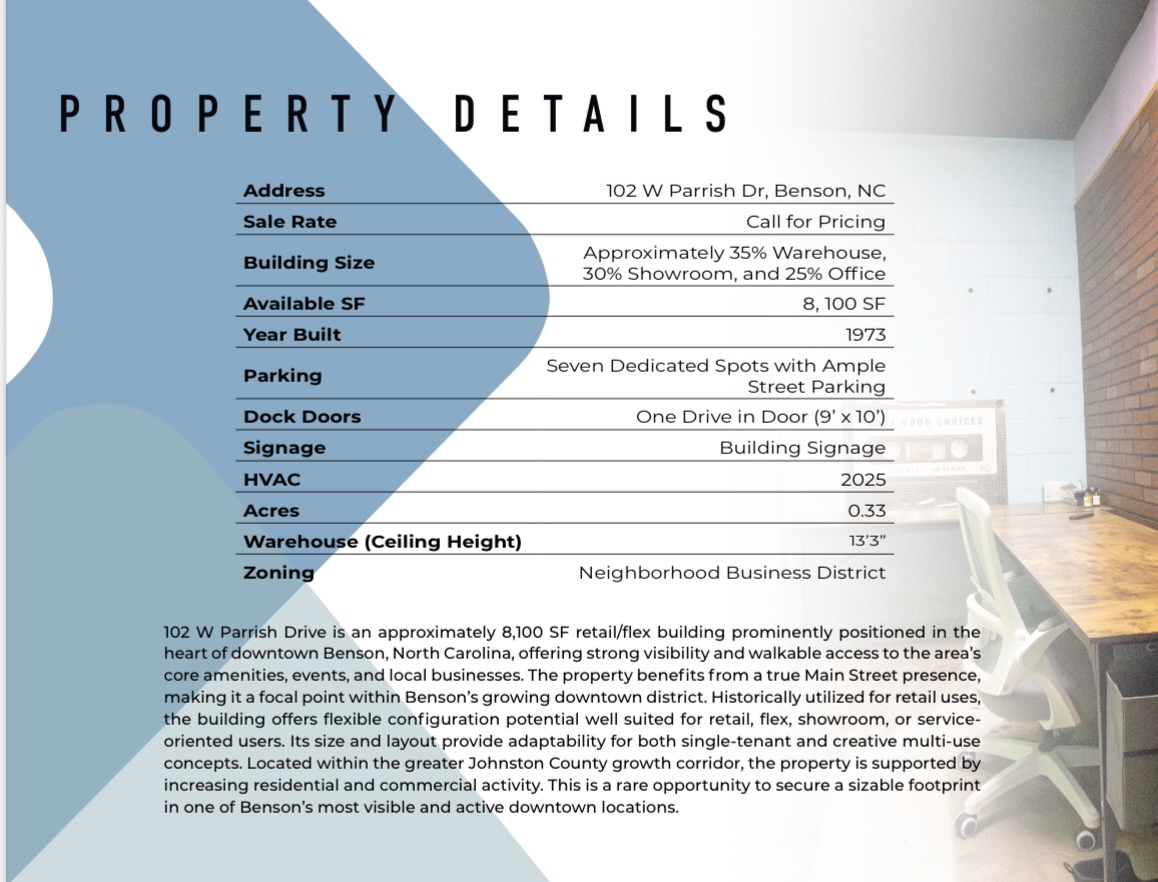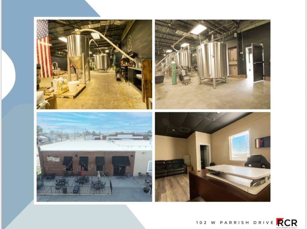 8,100 sq ft with parking in a friendly and growing downtown area of Benson, NC. Everything you need and right off I95 for distribution and travelers taking a break at two hotels in town. Currently the building houses a taproom and 10bbl brewhouse with fermentors, Brite tank, grain crusher and grist case, over 180 Kegs, keg washer, chiller, etc. plenty of room for growth. Larger area to add a kitchen. See the attached marketing flyer. Please call with any questions. Call for pricing.