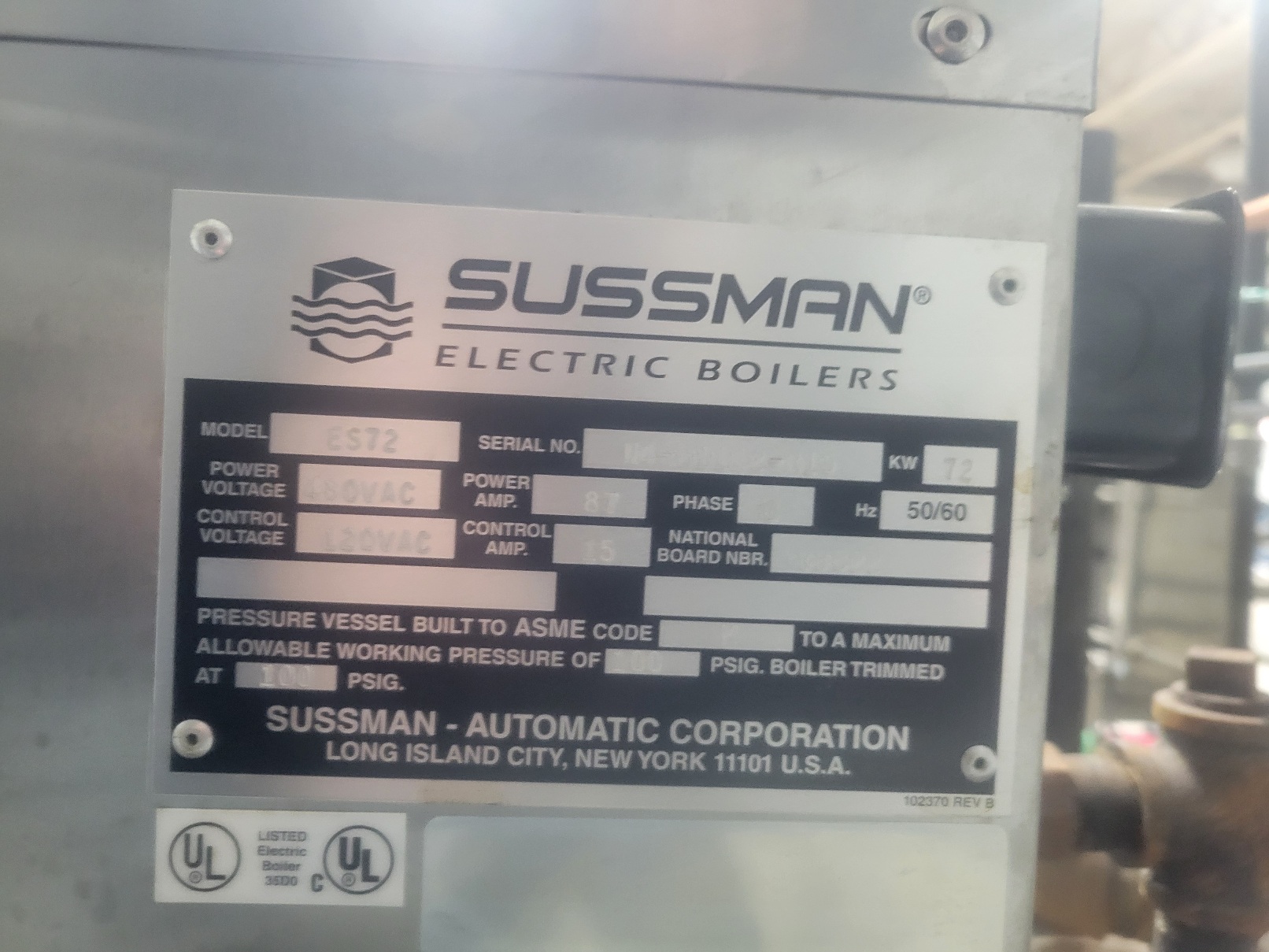 Sussman es72 boiler. Runs on 480v. 3p at 87 Amp. Comes fully complete with threaded black iron steam piping,valves,kindorf strutt, strutt straps,nuts and bolts, everything you need to rebuild in your facility..except wire.insulation…etc… will run on 208v 3p but draws 200A so the transformer is a recommended investment. Everything pressure tested and certified by a local plumber and electrician before disassembly.