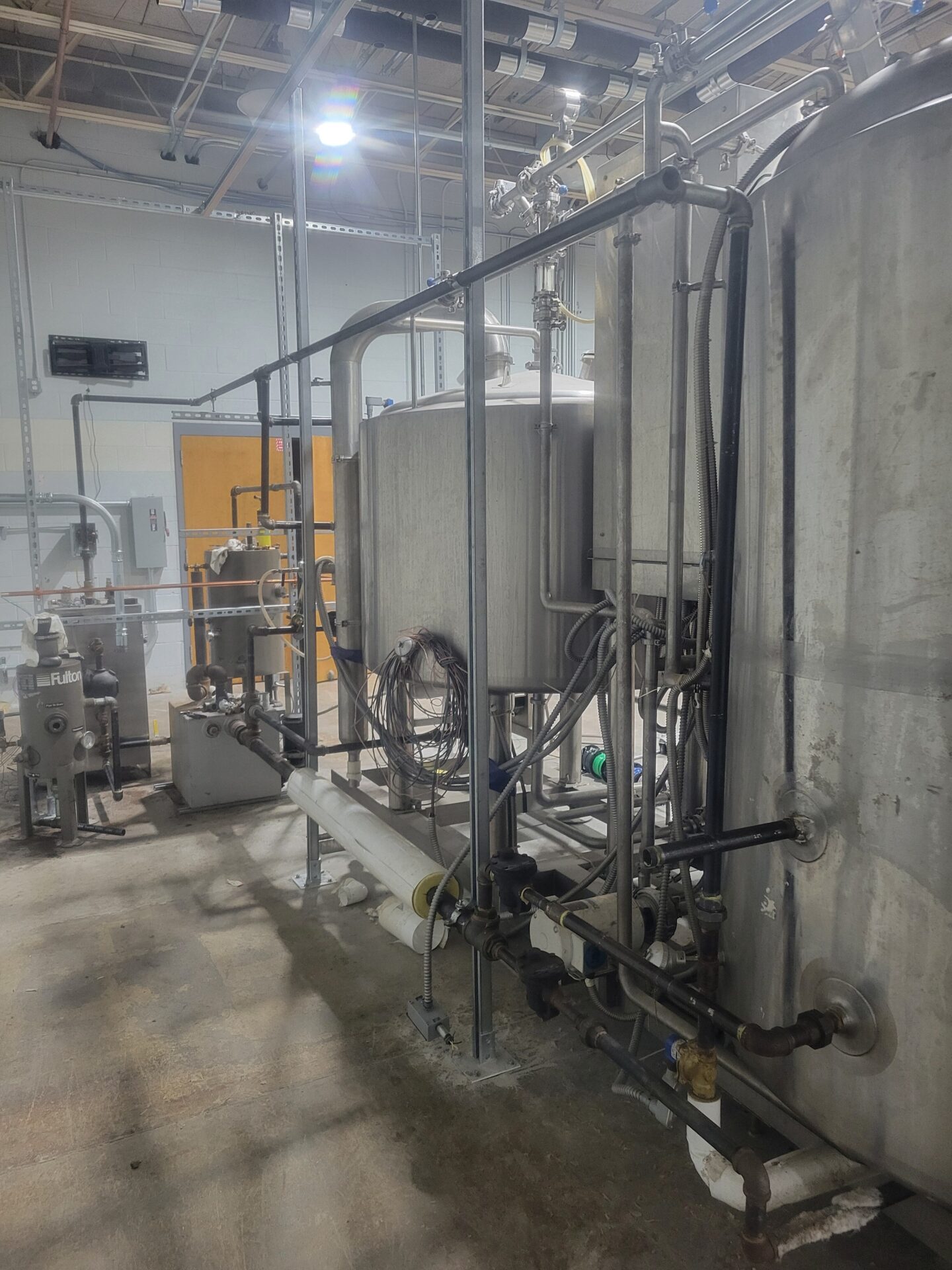 New touch screen computer interface. Controls brewhouse and 4 tank temp control. Can be wired for more. Electric boiler needs no seperate room or fire prevention. Complete with condensate collection tank and blowdown system. Complete with newly built and fitted black iron pipe, and full mounting system.