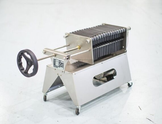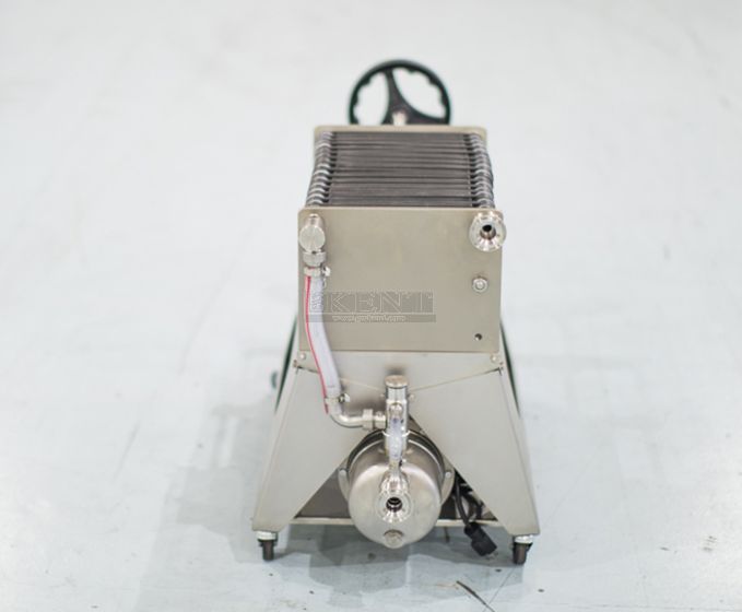 Plate & frame filter press is made in Italy by MORI TEM. It is built entirely out of 304L stainless steel. A plate & frame filter press is a tool used in separation and filtration processes in order to separate solids and liquids. Our filter is designed to filter wine, beer, distilled spirits, olive oil and other liquids. This filter can hold 30 filter sheets in the 20 cm by 20 cm size. This filter is mounted on wheels for easy mobility. It includes a crossover plate in the middle. The crossover/divider plate allows you to do a double filtration in a single pass. In other words, when you use the divider plate you can use 15 coarser filter sheets in the front and 15 finer filter sheets in the back. By removing the crossover plate you use all 30 filter sheets of the grade of fineness. The plates are made of Noryl, which is food grade sanitary and can be steam sterilized. You can remove about 5 plates when doing a smaller filter run, and can add about 5 plates when doing a bigger run, but you would need to purchase some extra plates. This filter comes with a ½ hp centrifugal pump with 110 V plug. Uses small 20 cm X 20 cm filter sheets. Standard 40 cm X 40 cm filter sheets can be sliced into 4 equal squares and then used in this filter. weight 150 lbs