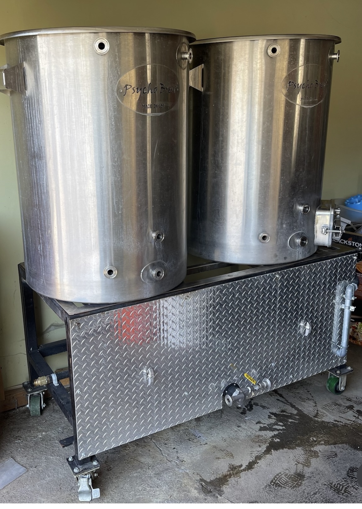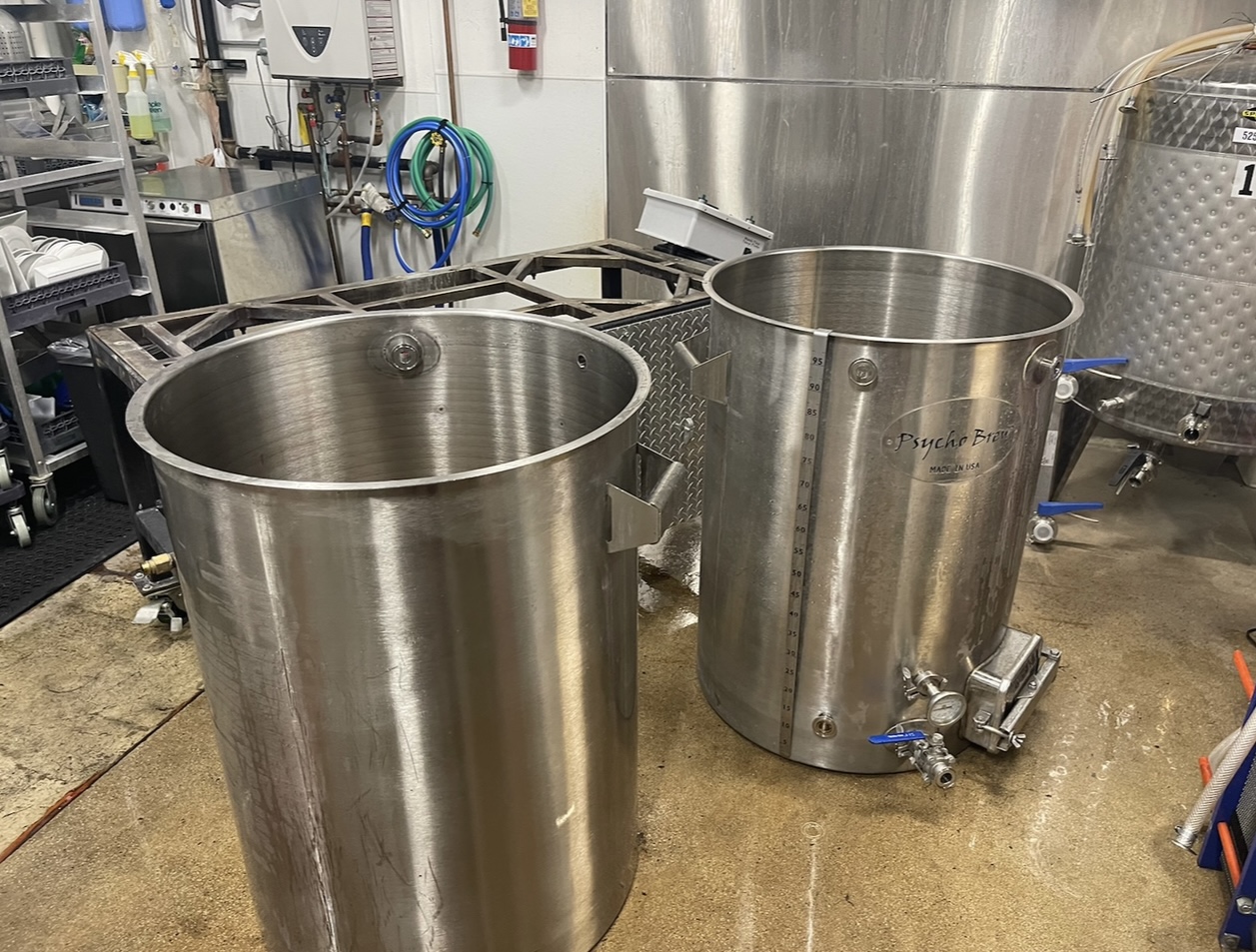 Used 2.5BBL Natural Gas Pyscho Brew Pilot System, comes with recirculating pump and 4BBL Spiedel Non-insulated Fermentor(can be used as a hot liquor tank for spare) One Handle on mash tun and boil kettle need to be soldered back on. Sold as is/Local Pickup Only