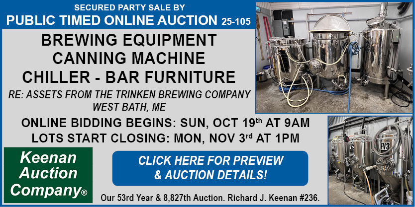 1 – Canning Line – 3 head ABE canning line equiped with can loading slide, in line labeler and pack off table. Equipped for 16 oz. 202 bright aluminum cans, including remaining inventory of cans – $100,000
