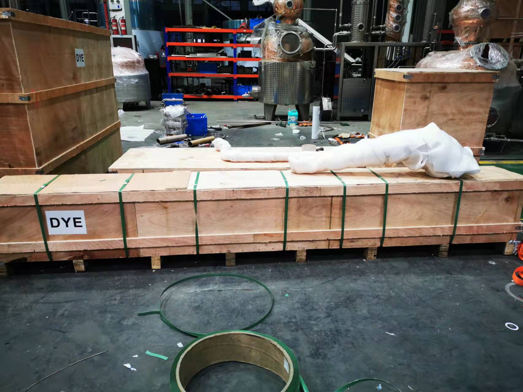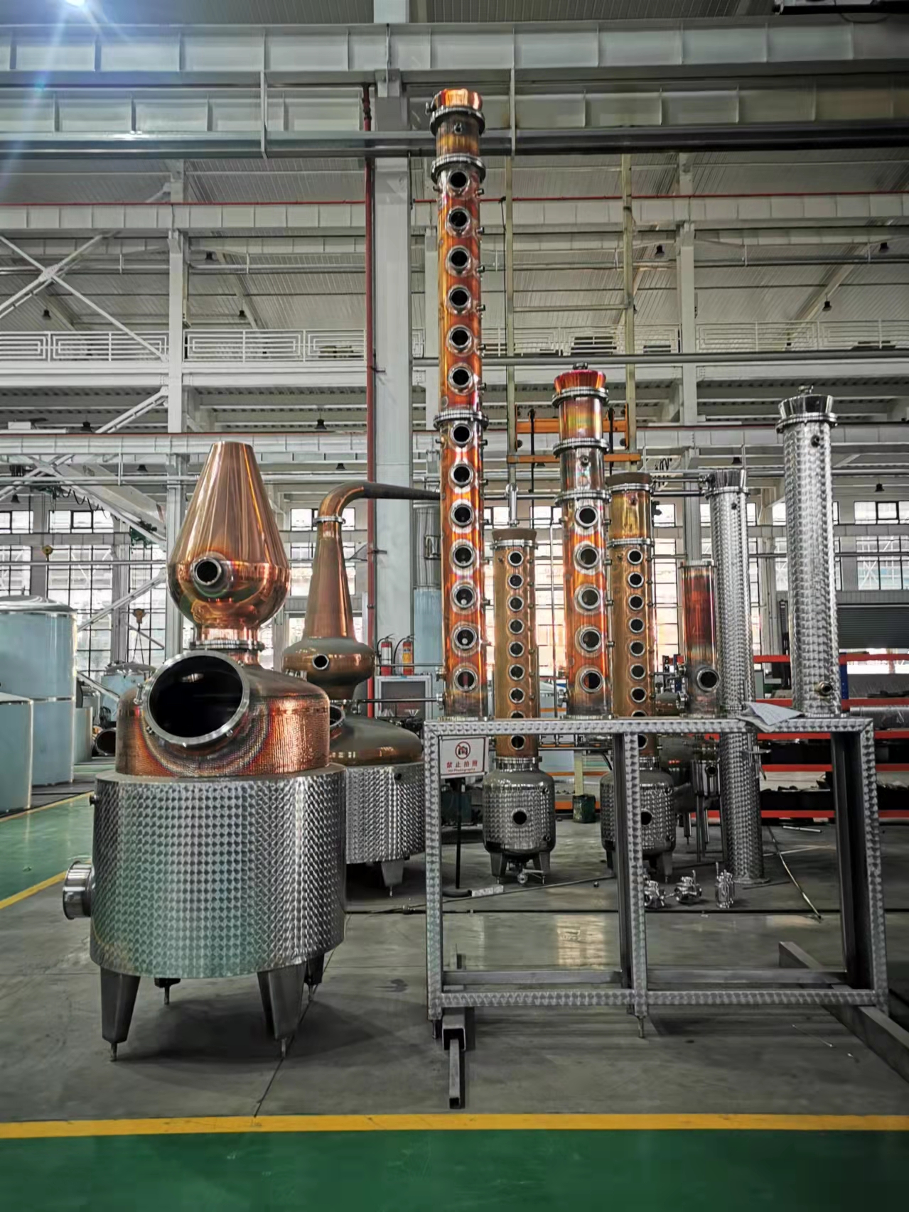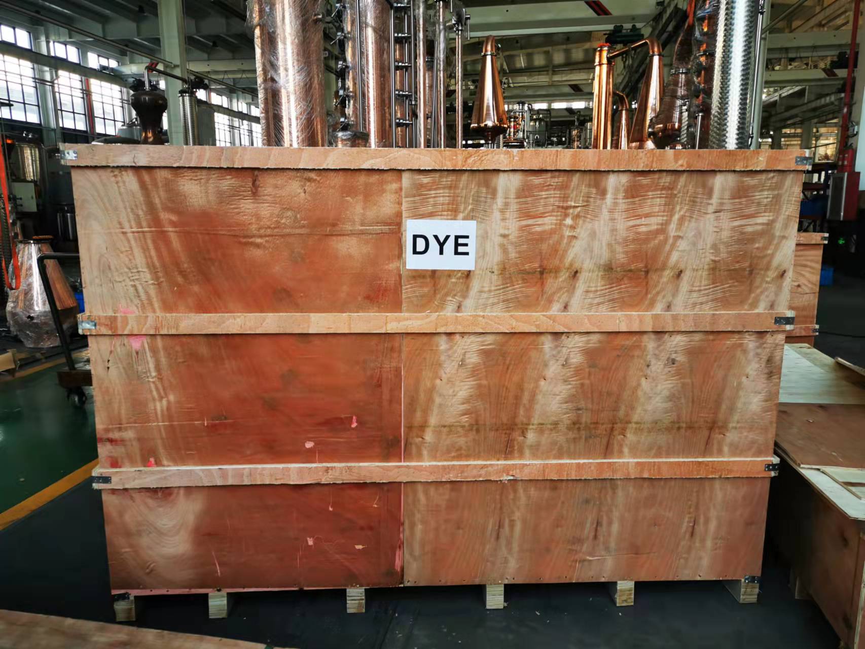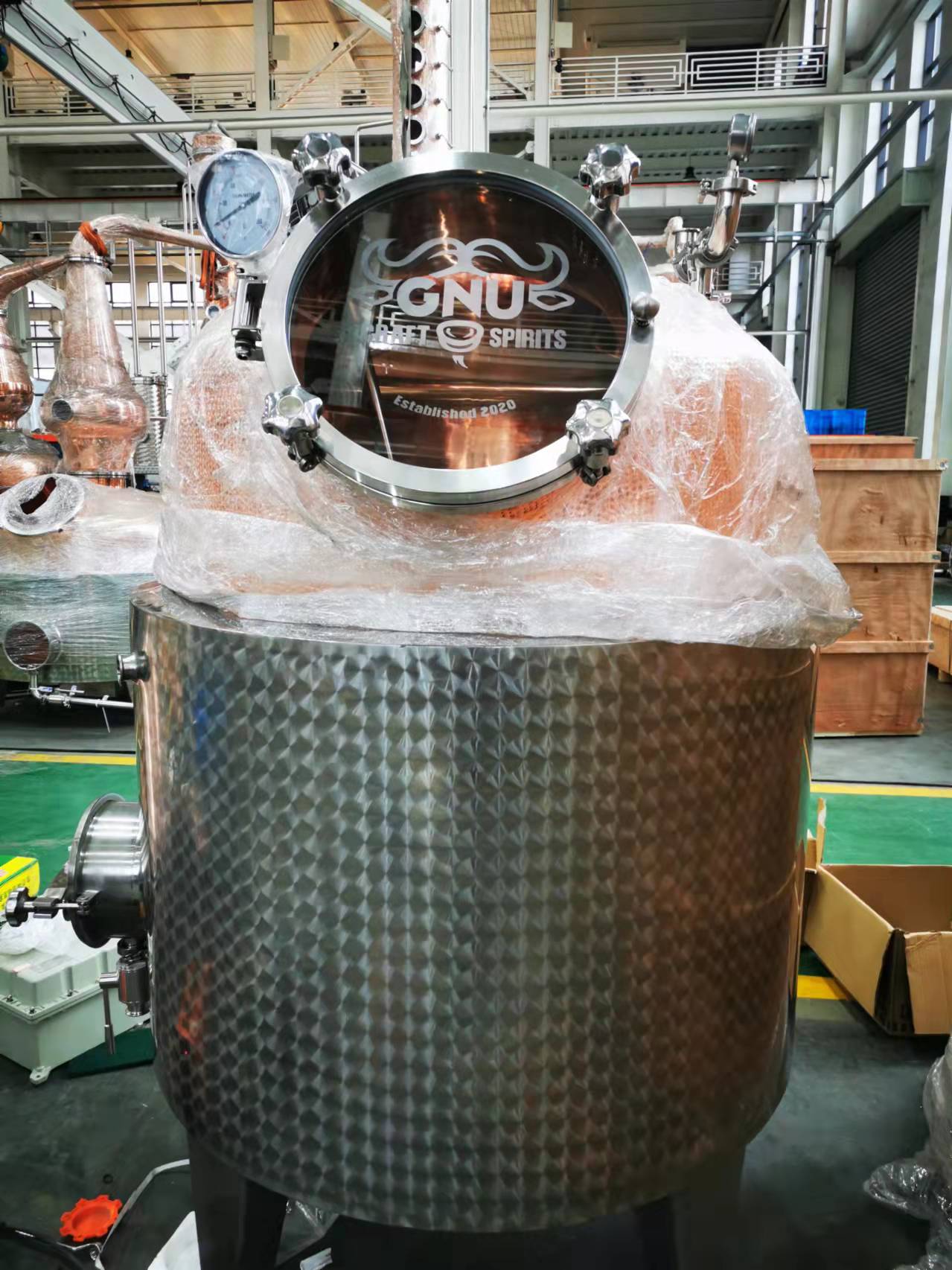 Brand new, steam heated still. Beautiful copper kettle with helmet and Lyne arm, dephlegmators, columns and gin basket. Super cool hammered finish on kettle. Columns have 12 plates and 4 plates with CIP balls. Stainless steel condenser with copper tube. Agitator with UL explosion proof motor. Control box for agitator, lights and CIP pump. Stainless steel stand with 300L water tank, 200L hearts tank, 100L heads and 100L tails tanks. All parts still in original shipping crates and ready to move to your location for assembly and production of high quality spirits of all types and ABV.