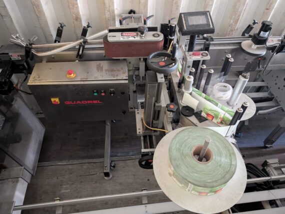 Quadrel pressure-sensitive labeling system available (PSL style). Designed for applying pressure-sensitive labels to containers (commonly cans, bottles, jars, or similar packaging) via conveyor-based label application. Visible features: Quadrel Labeling Systems machine base/control cabinet HMI/control interface present Label web/roll handling and applicator station (as shown) Recommended buyer requests / verification: Nameplate/model/serial and label head details Container size range, label size range, and any included change parts Electrical requirements and any air requirements Conveyor dimensions/working height range More info and additional photos available at bielmanbrausupply.com.