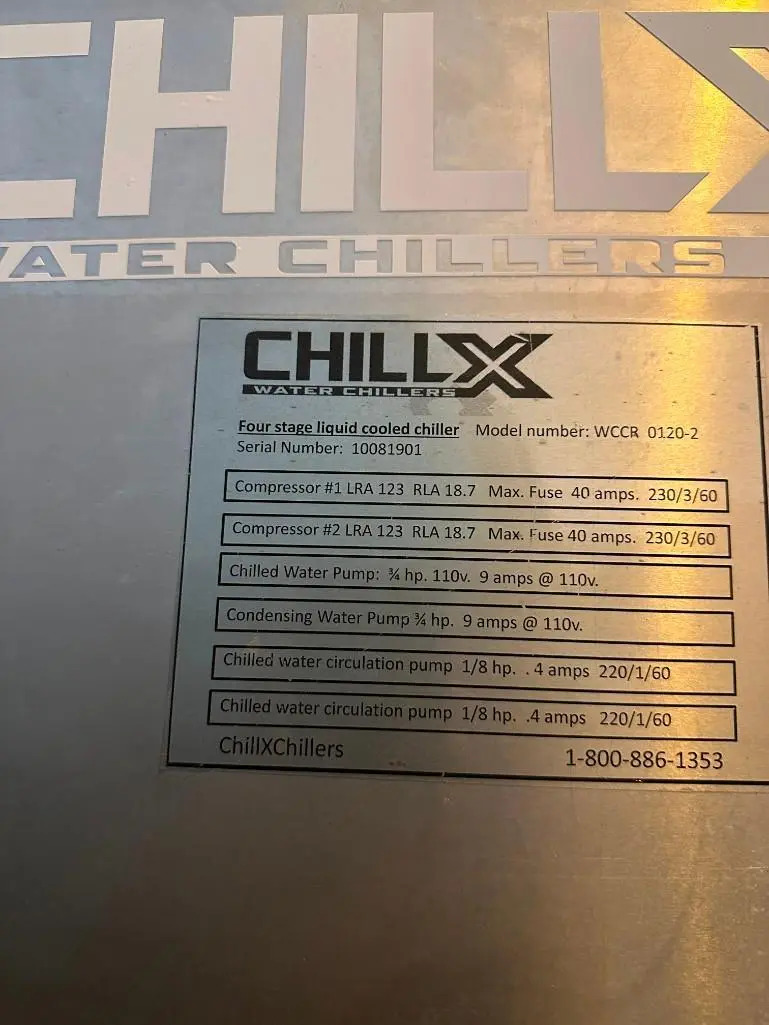 ChillX Four Stage Glycol Chiller Model: WCCR 120-2 Serial: 10081901 3 phase, 230v, 40 amps Single operating compressor Water pump and cooling tower Located: Decatur, IL Load at no cost