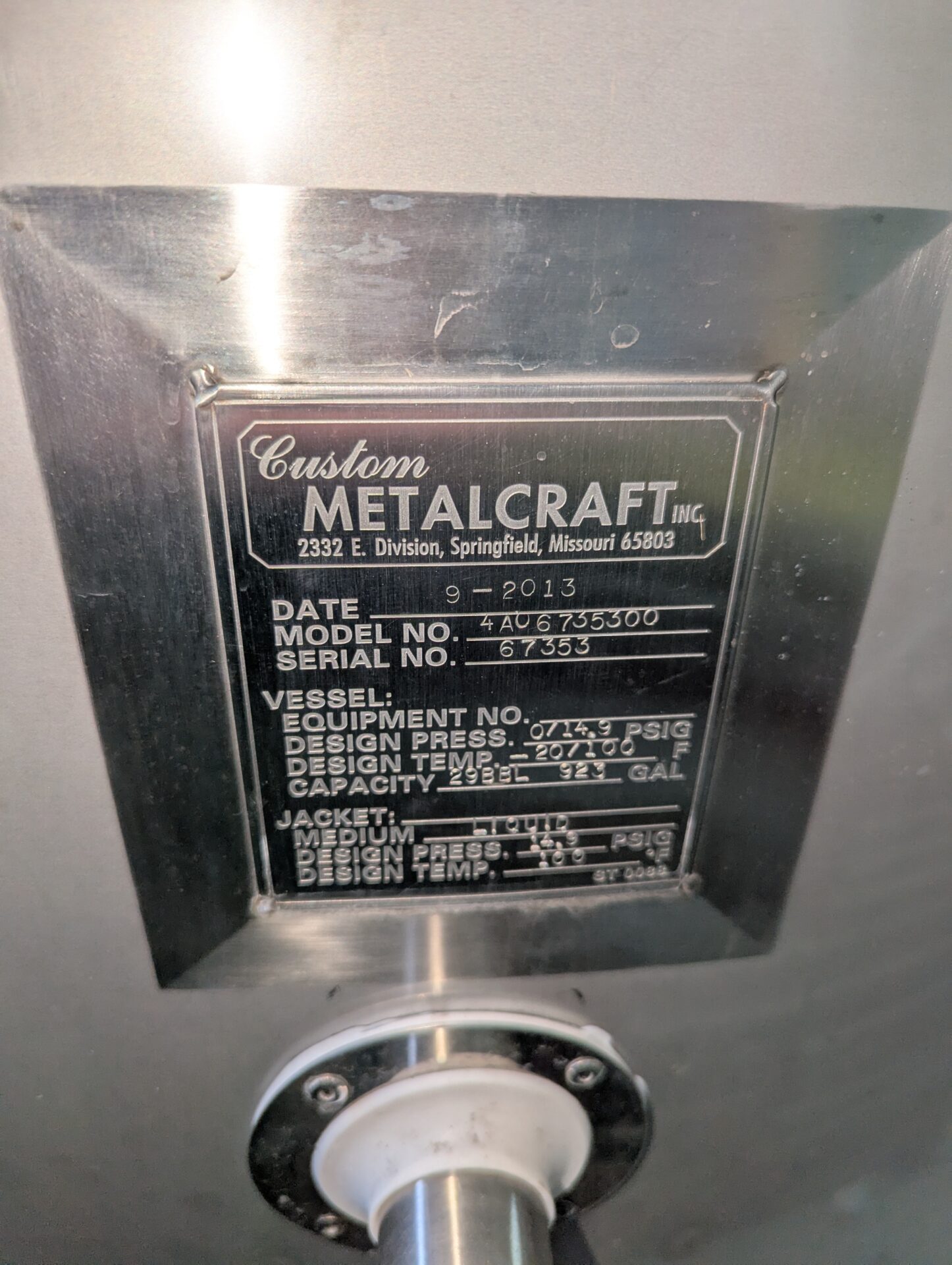 29 BBL (923 gal), jacketed Custom Metalcraft Brite Tank.