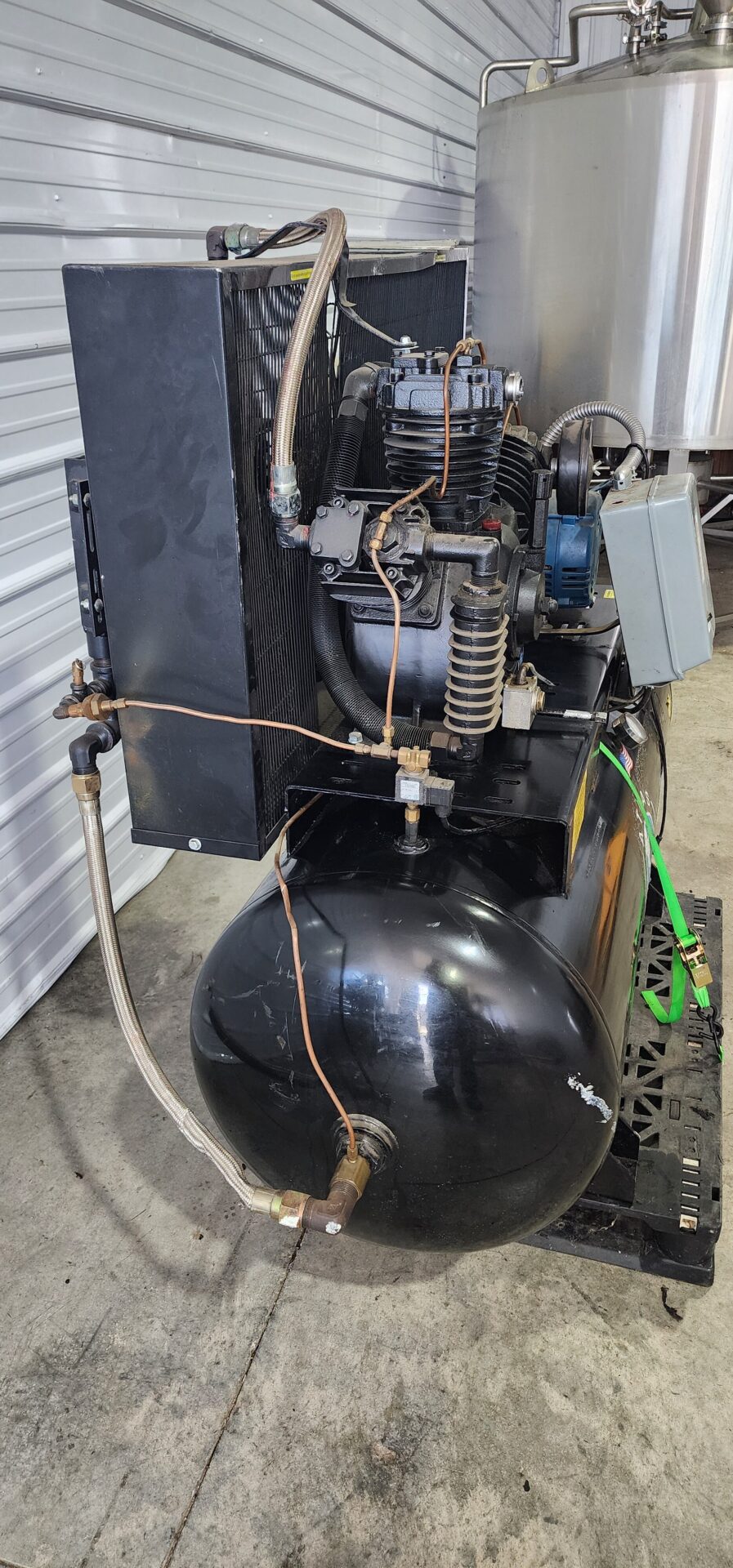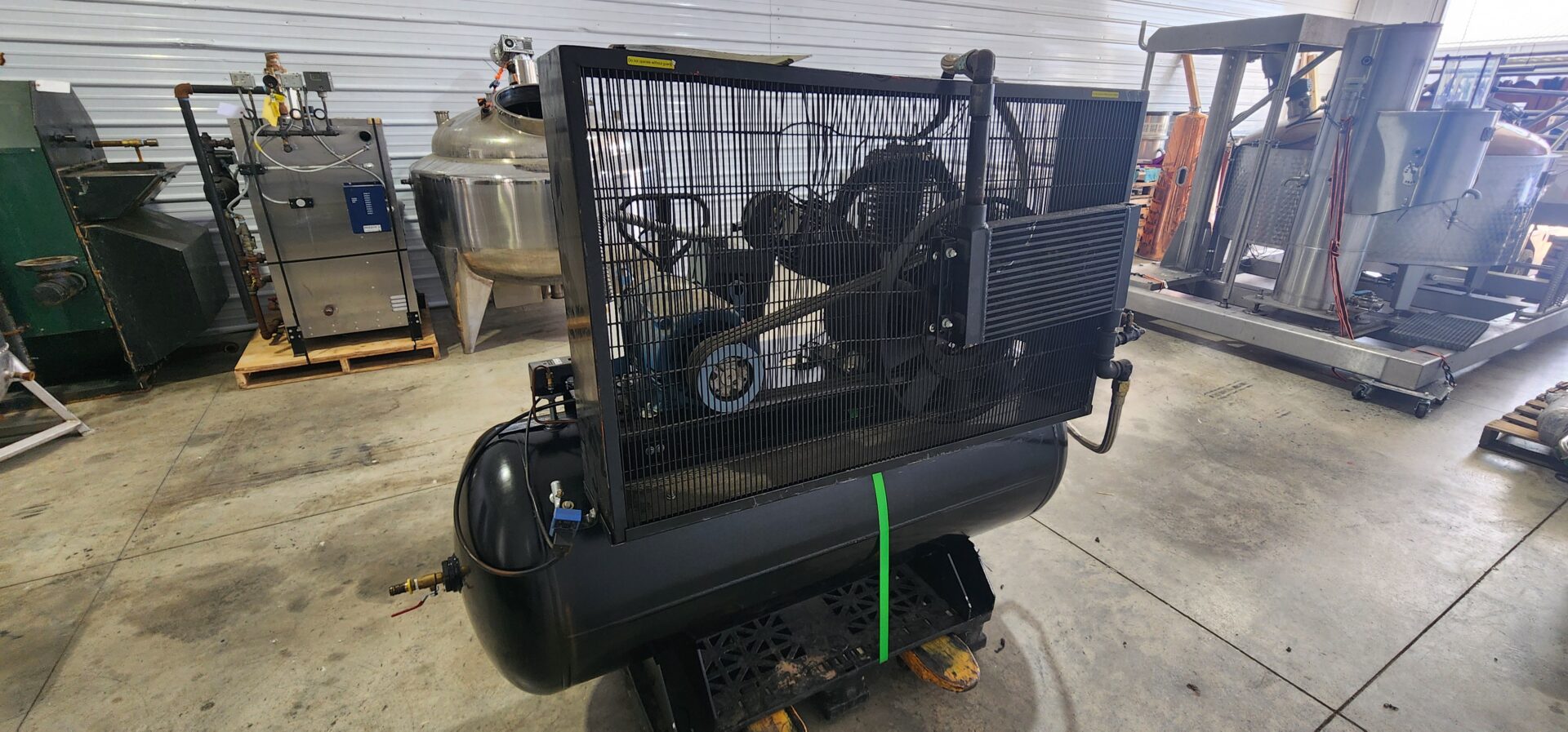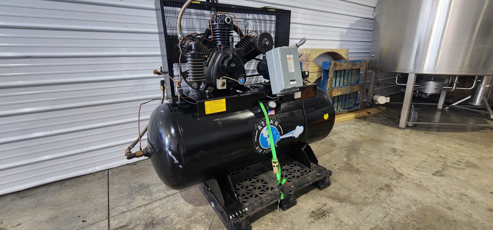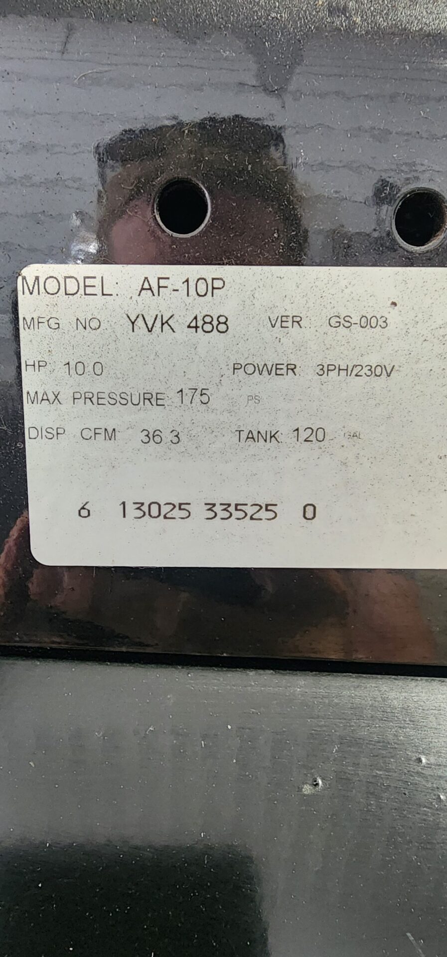 Used AF-10P 10HP industrial air compressor in excellent working condition. Delivers 36.3 CFM at 175 PSI with a 120-gallon tank, powered by a 230V 3-phase motor. Ideal for brewery, fabrication, or shop air systems needing consistent pressure and volume.