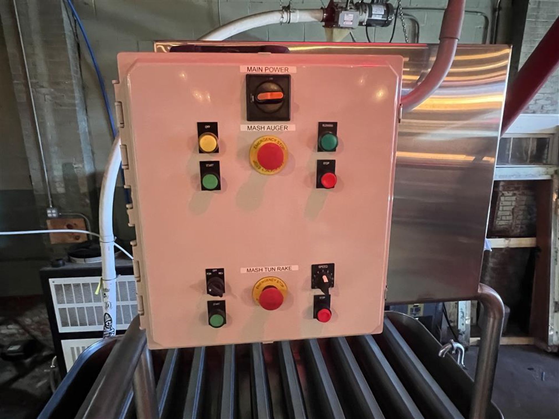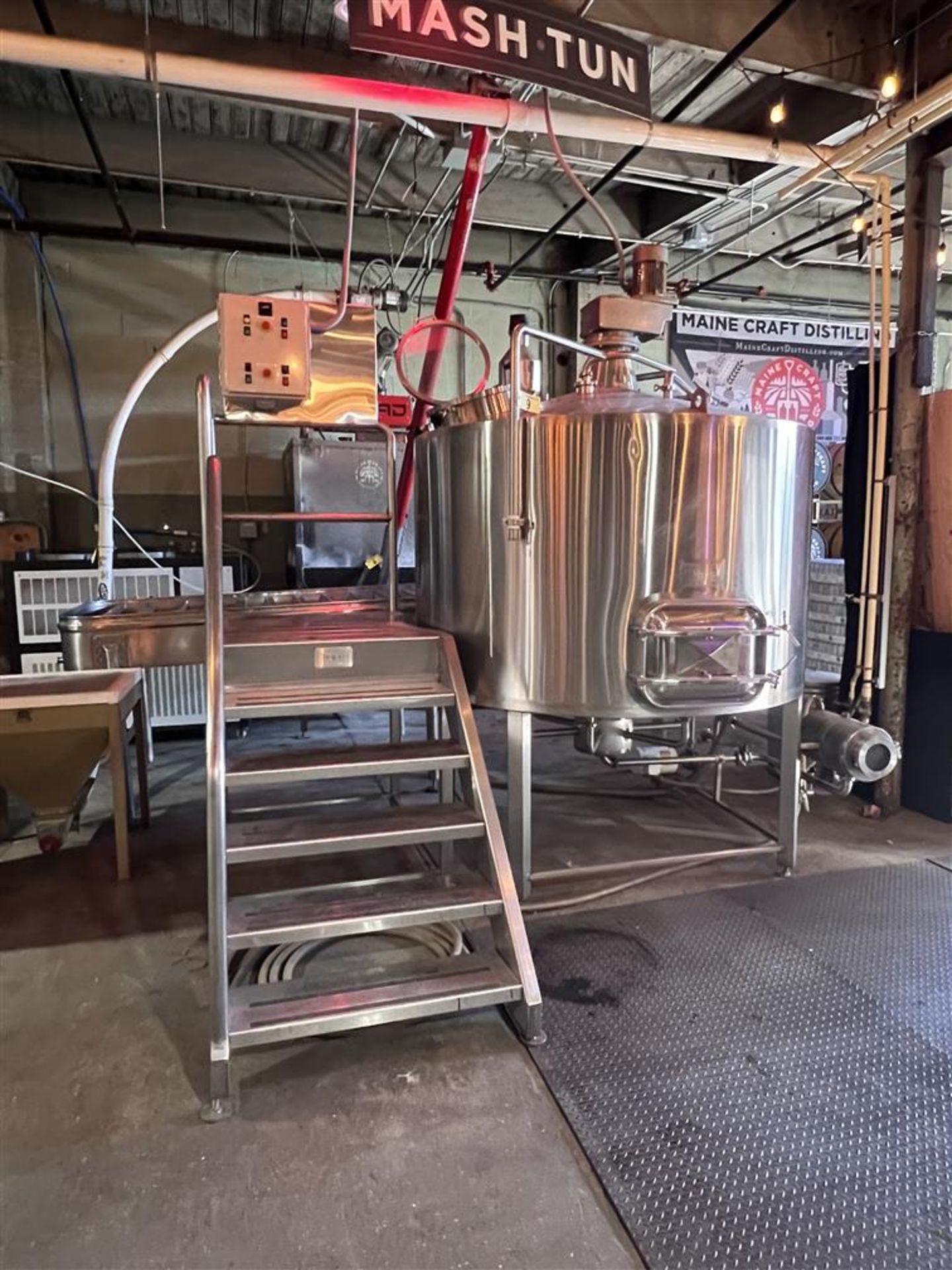 We have a super nice mashtun setup from a distillery closure we decommissioned earlier in the year. This is a LARGE mashtun (message us for exact dimensions) that has many extras! It has the platform with control panel, a motorized rake, a transfer pump and more. This is a serious setup to get your distillery rocking with a large mashtun to produce beer for your column.