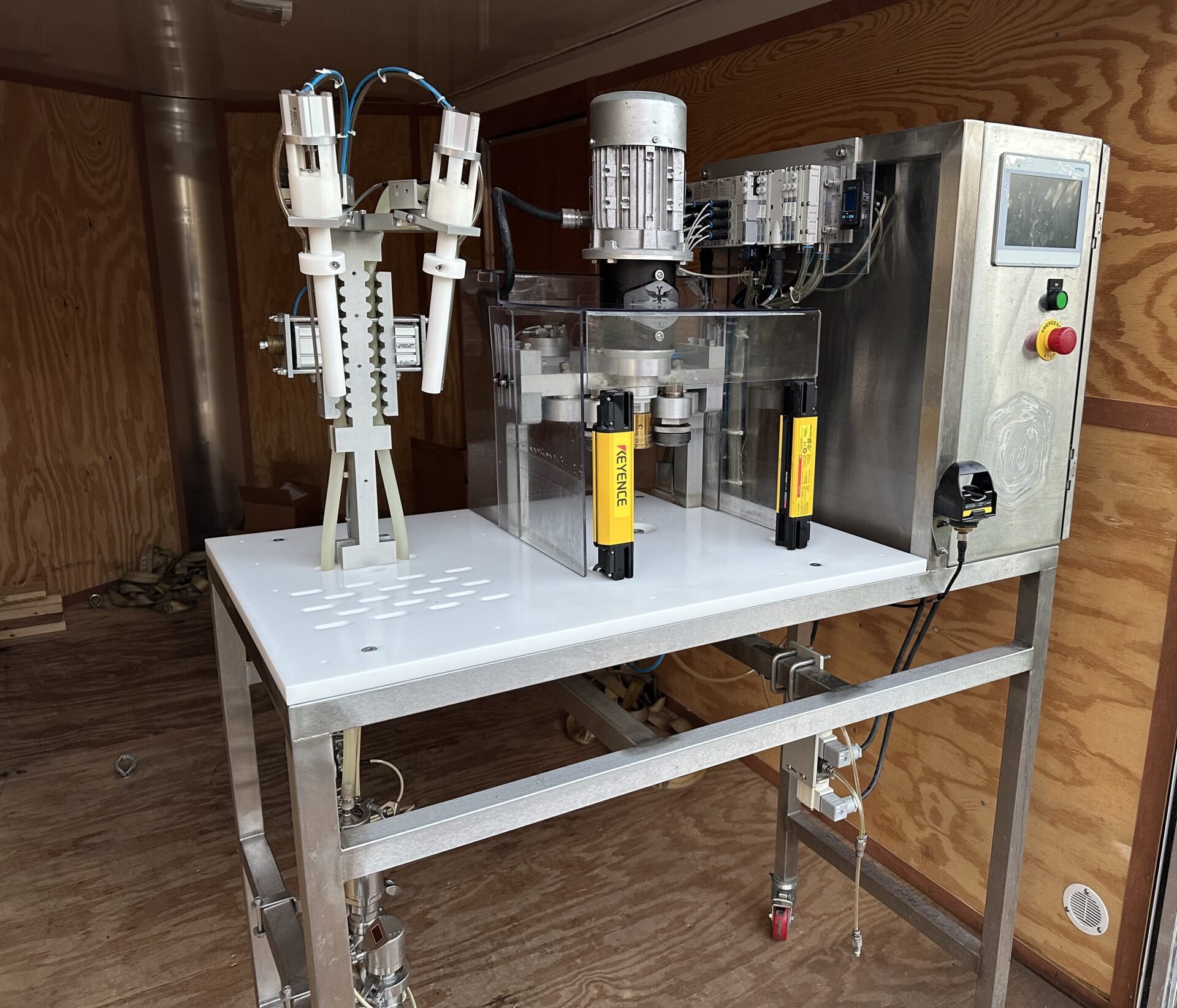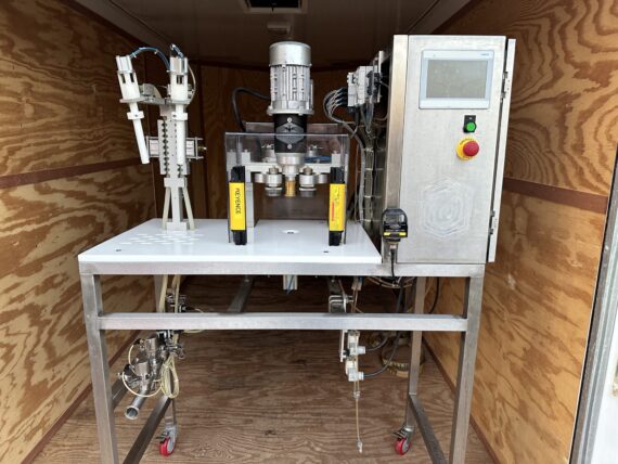 Wild Goose WGC-50 for sale. This system has pressure and temperature monitoring installed along with the flow meter option. Roughly 30k cans have been run. Two head fill station and seaming are semi-automatic with manual lid placement. Roughly 12 cans a minute. Set up to do 12 oz. but can be used for 16 oz.