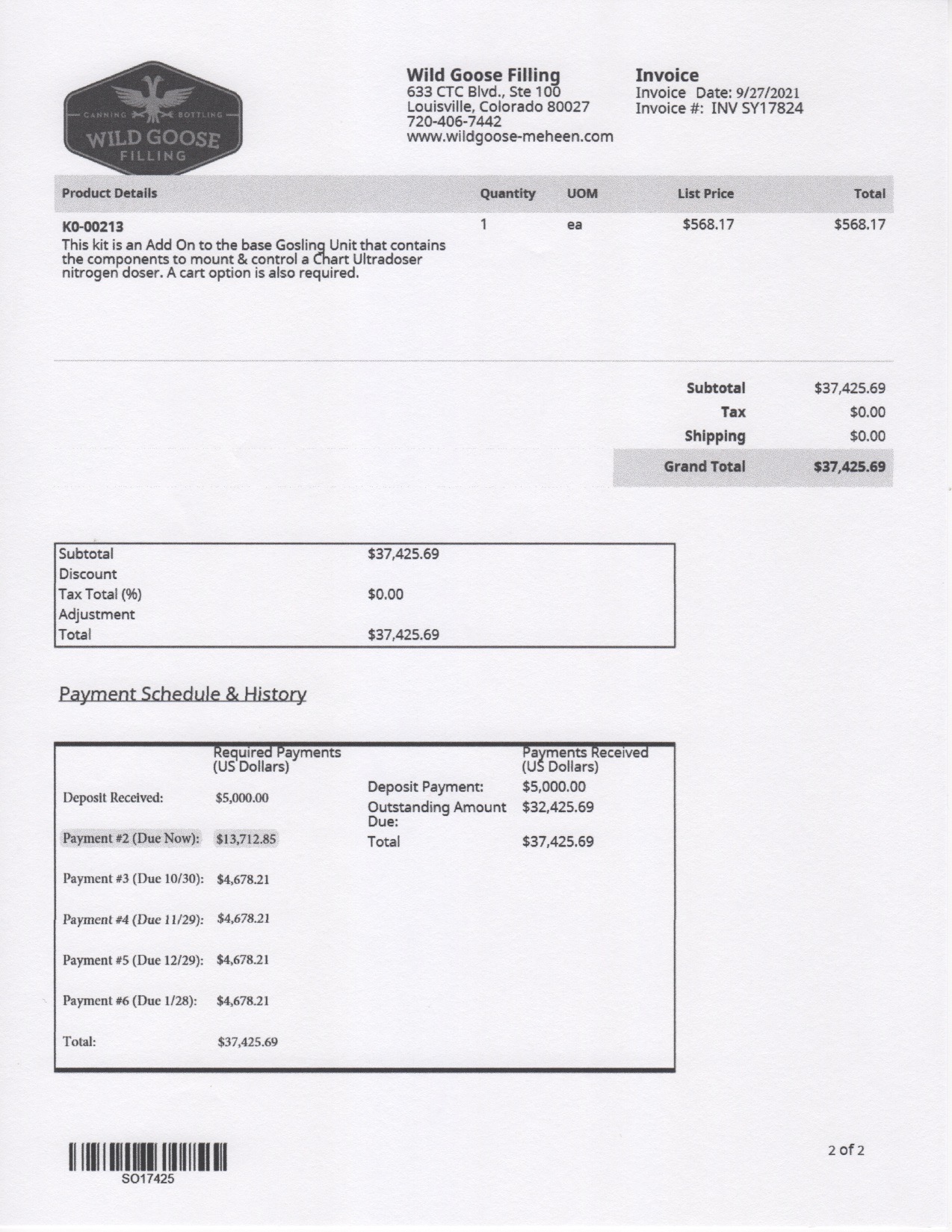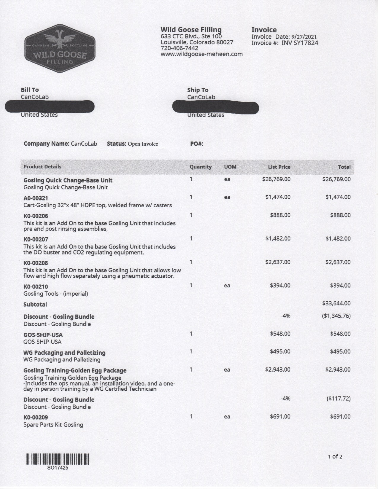 We are selling our Wild Goose Gosling 1.0 canning machine received in 2022. This machine was never unpacked from the pallet received from Wild Goose Filling and was intended for a side project that continued to get delayed. The palletized Gosling has been stored in a temperature controlled environment since delivery. The invoiced amount of $37,425.69 included DO buster, CO2 regulator, pneumatic actuator, and Nitro doser. Invoice # and status can be verified by Wild Goose Filling as they have been reaching out every quarter to schedule training. Wild Goose Filing confirmed training is not transferable – deducted original training and shipping costs. Asking $34,000 OBO.