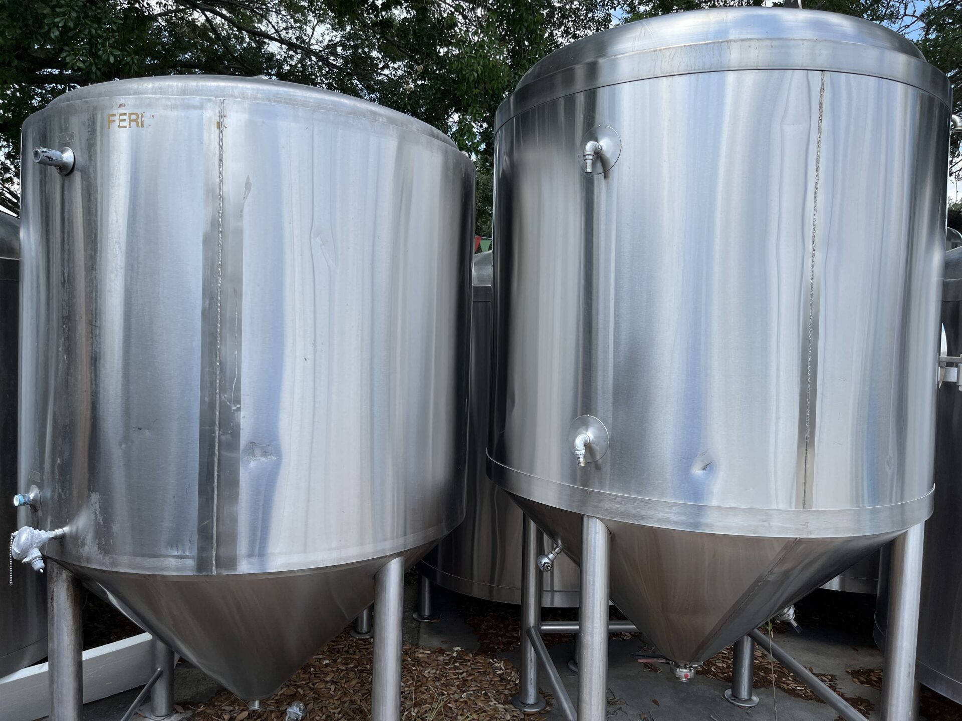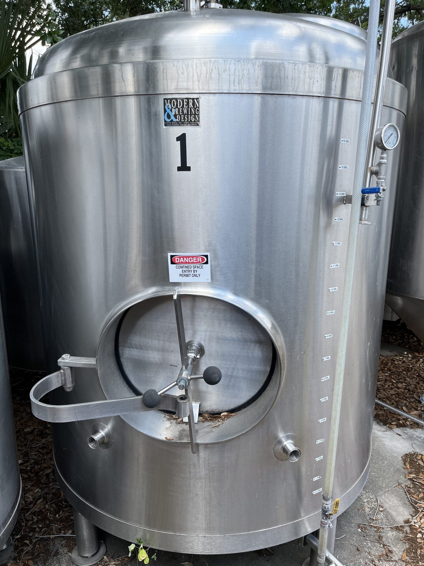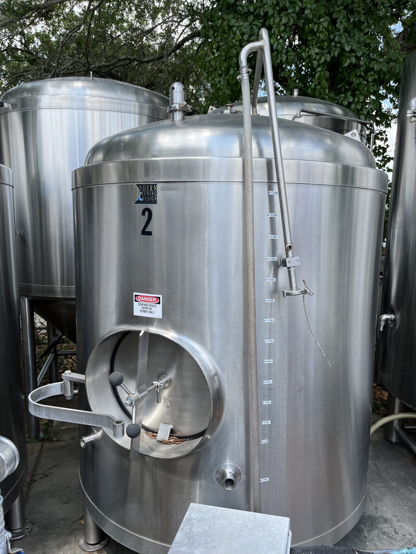 This is a 15bbl modern brewing brew system that includes: Mash boil with agitator, Laudertun with agitator, Whirlpool, six 15bbl fermenters, six 15 bbl brite tanks, Hot liquor tank, Cold liquor tank. This system was built by Modern Brewing. The tanks have been stored outside for about a year, but other than being dirty are in good condition.