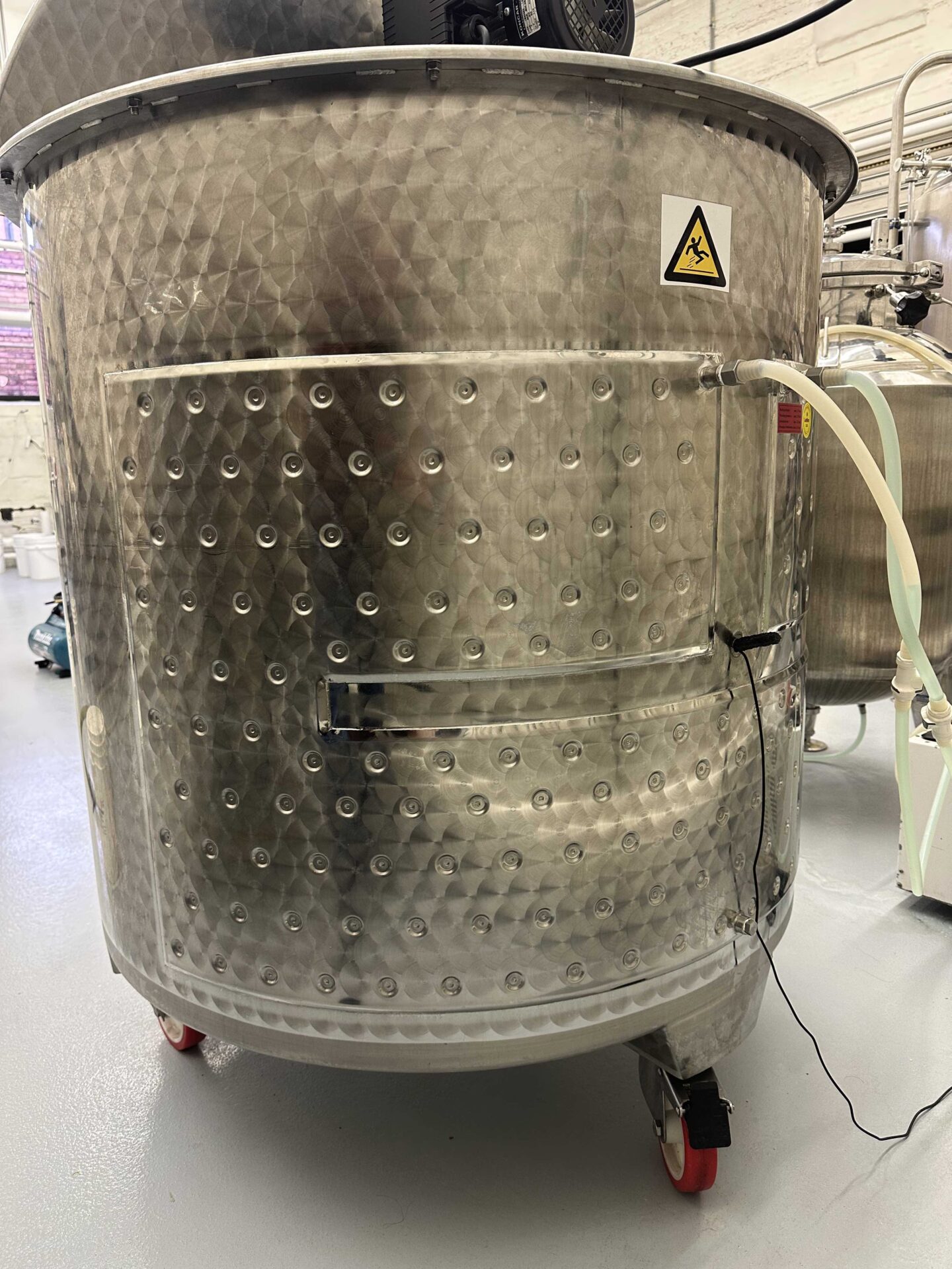 1000 liter / 265 gallon jacketed 304 stainless steel mixing tank with wheels in excellent condition. Glycol jacket 1 meter square across back, with ½” fittings, rated at 2.5 bar. Last used in February and has not been moved since.