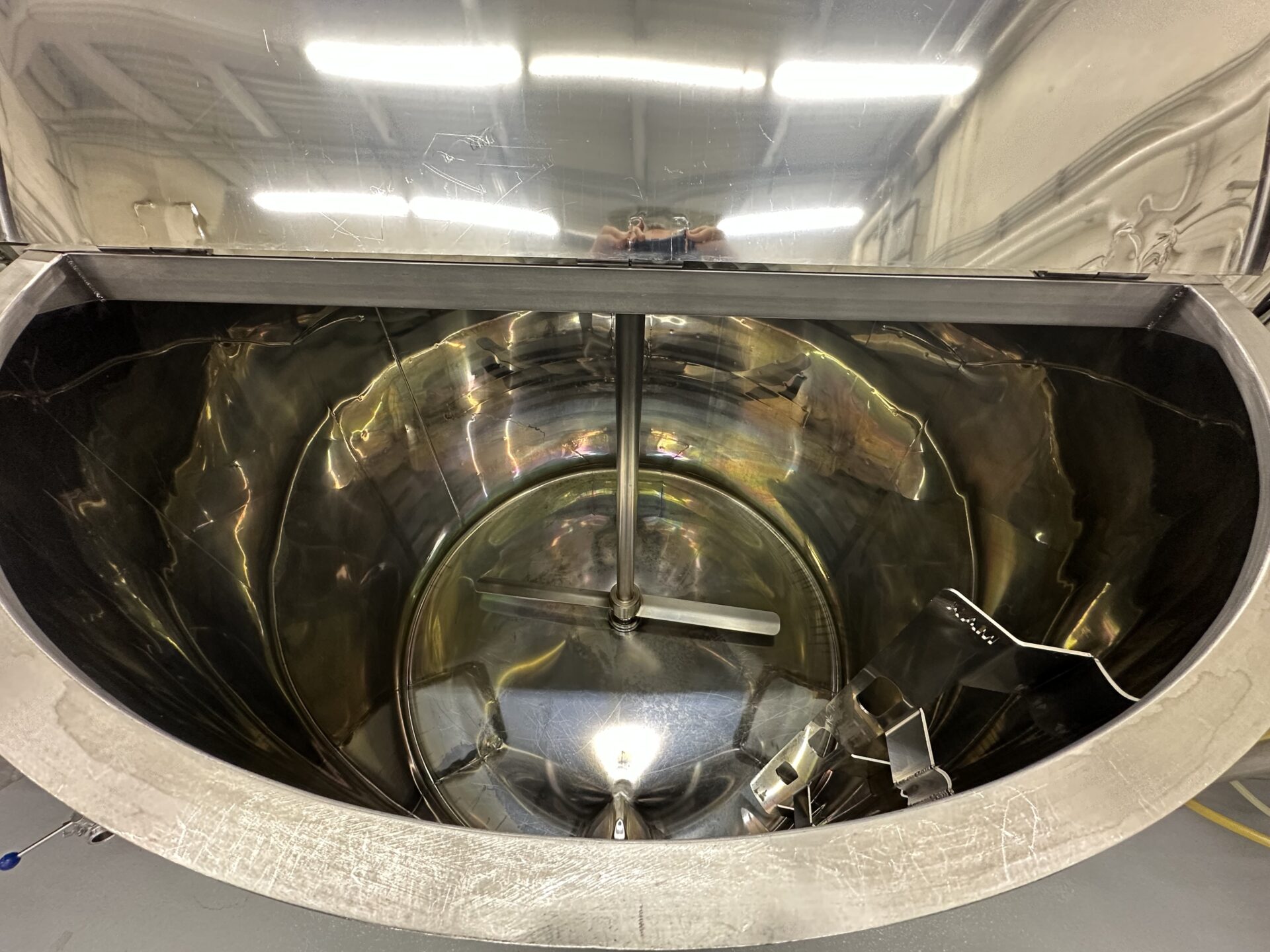 Folding cover, conical off-center bottom, gear motor 0.75 kW 230/240V 1 ph, shaft with blade paddles, interior baffle, thermowell, bottom discharge assembly with 1.5” butterfly valve, interior mirror finish, exterior brushed circle.