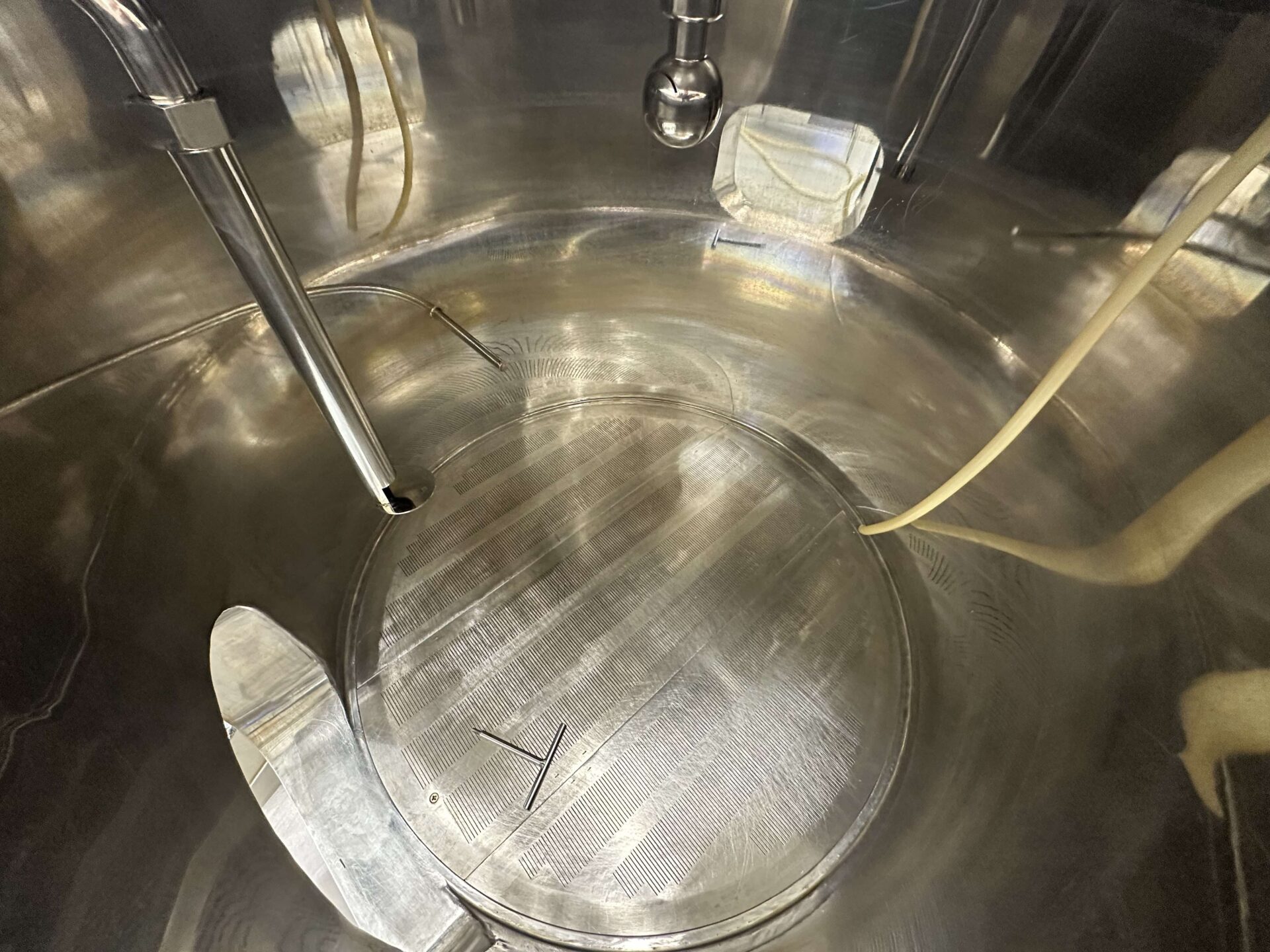 Rectangular side manway, mirror polish exterior finish, open top design with lid, false bottom removable in 3 sections. Includes bottom drain assembly with butterfly valve, thermowell, 1.5” Vorlauf pipe (adjustable ~19-32”), and CIP fitting with ball.