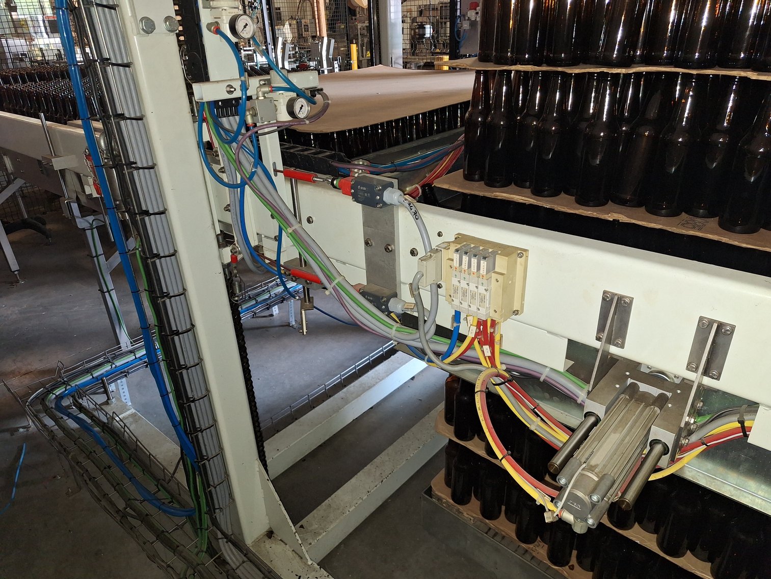 Semi-automatic machine specially designed for medium to low production, depalletizes containers and can remove flat and / or inverted tray interlayers. The depalletizing is performed with a sliding system of the complete layer on the bottle unloading table, which is equipped with a multi-way outlet.