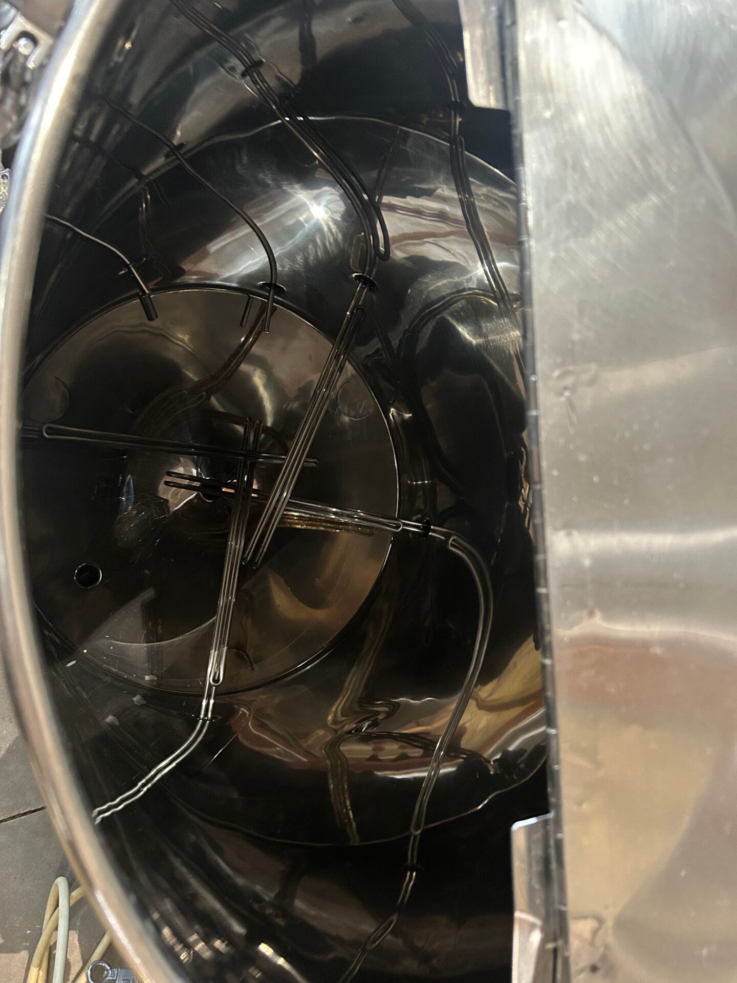 – 3.5bbl electric kettle with sight glass, 4 heating elements, and welded tangential whirlpool arm