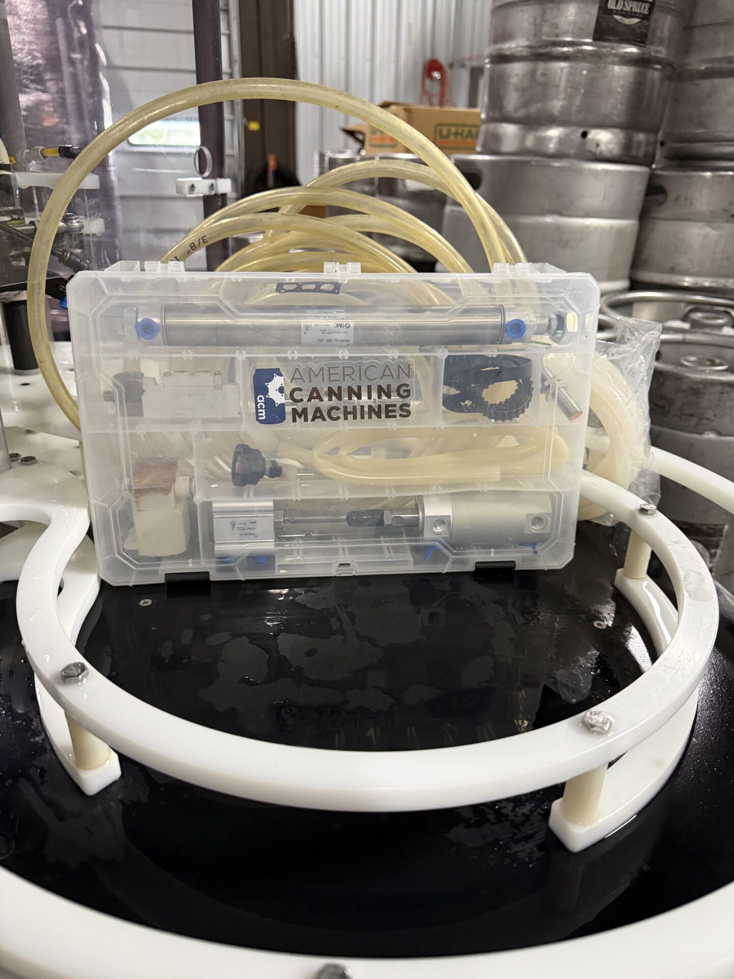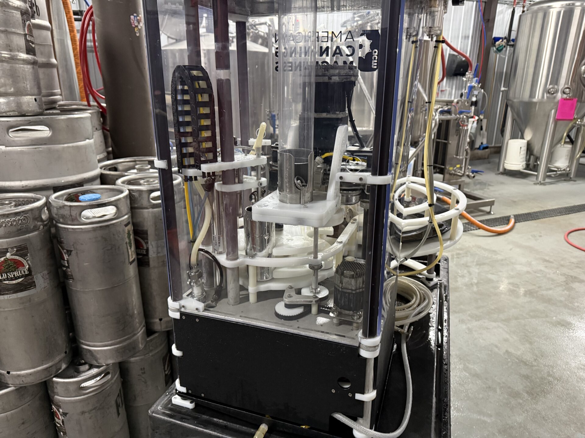 AT-1 canner in good working condition with cart, infeed/outfeed table and spare parts. Was used for 2.5 years until it was outgrown. Will process 12 or 16oz standard body cans. Currently set for 16oz but easily adjustable to process 12oz. Will process ~5-7cpm for 16oz cans. Just hook to fresh water supply with standard garden hose connector, compressed air, CO2, and beer supply from Brite or Keg. Will can any lightly carbonated beverages even coffee or kombucha. Buyer arranges shipping or pickup